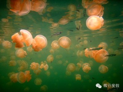 【水母湖JellyfishLake】帕劳最具特色的景点之一,拥有全世界罕见的无毒水母。在接近中午的时候它们会浮到水面进行光合作用,水面密密麻麻的水母,一闪一闪地散发着淡淡的橘色光茫,耀眼又壮观。湖中也有大群的银面鱼及透明的月亮水母,全都是温和无毒的。沿着已开辟好的小径爬过一段陡坡后即可感受和一大群对人体无害的水母一同浮潜的喜悦。